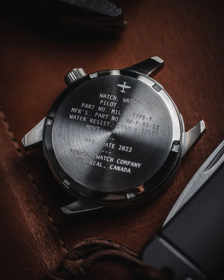 The screw-down caseback of the Redwood Pilot Type B might appear cryptic for the uninitiated with several lines of coded text engraved into the solid stainless steel piece. In a tip of the hat to government-contract timepieces, the caseback features important information about the watch including model number, type of movement, water resistance rating, date of manufacture as well as manufacturer contact information.